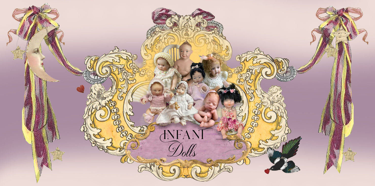 Regular price$166.50Regular priceSale price$166.50 Save $-166.50 (%)Unit priceperSeated Infant Baby Girl With Purple Ribbons OOAK Artisan Clay Miniature Doll