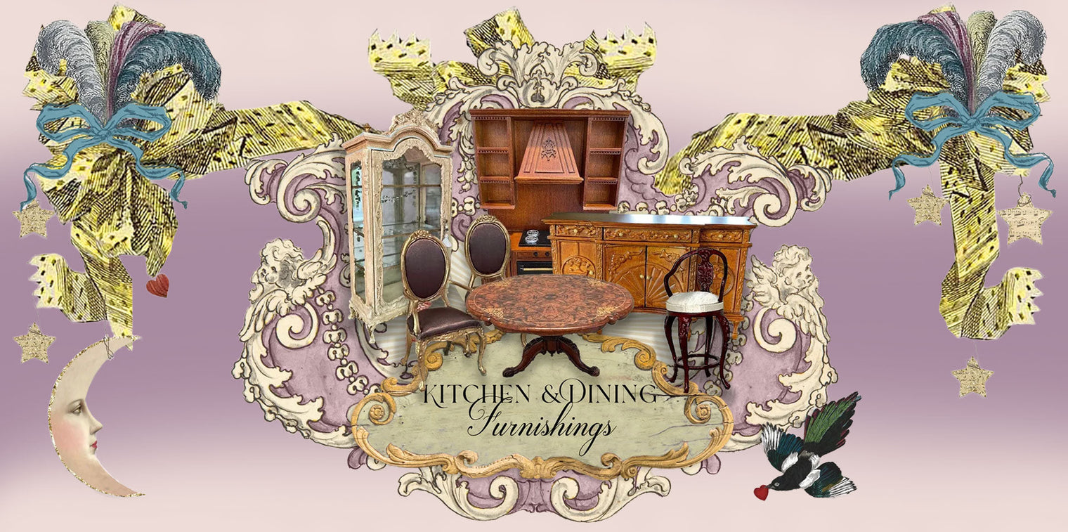 Kitchen & dining furnishings bring warmth and daily rhythm to the miniature home… these pieces gather together moments of preparation, conversation, and shared meals. They are the heart of lived-in scenes, rich with quiet detail and purpose.